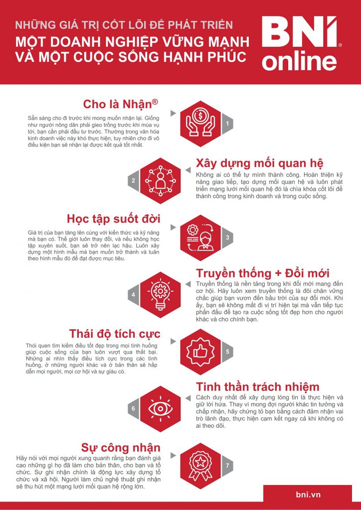 - Chuẩn Mực – tuân thủ hệ thống, chuẩn mực trong thực hiện triết lý BNI.